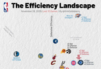 横轴代表进攻效率,越靠右越好,纵轴代表防守效率,越靠上越强。第一象限的球队多为发挥出色的球队,而在第三象限的球队通常为战绩比较糟糕的球队。