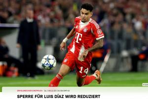 拜仁官方:迪亚斯上诉成功,欧冠禁赛由3场缩短至2场