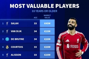 体育资讯12月7日讯 德国转会市场统计了年龄33+球员的身价,并列出榜单,萨拉赫4500万欧居首,梅西1800万欧第七。