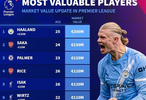 北京时间12月9日,在更新了英超球员的身价之后,德转列出了目前英超身价排名前10的球员。此次身价上涨2000万欧元,目前身价达到2亿欧元的哈兰德高居第一,萨卡身价虽然下跌1000万欧元,但仍以1.3亿欧元排名第二,帕尔默、赖斯以及伊萨克同以1.2亿欧元并列第三。