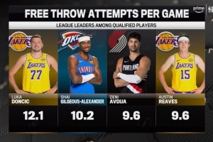 NBA杯1/4决赛今天进行,赛前转播方晒出本赛季罚球次数前四: