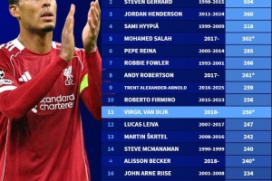 利物浦队史英超出场榜:范戴克250场第11,阿诺德259场第9